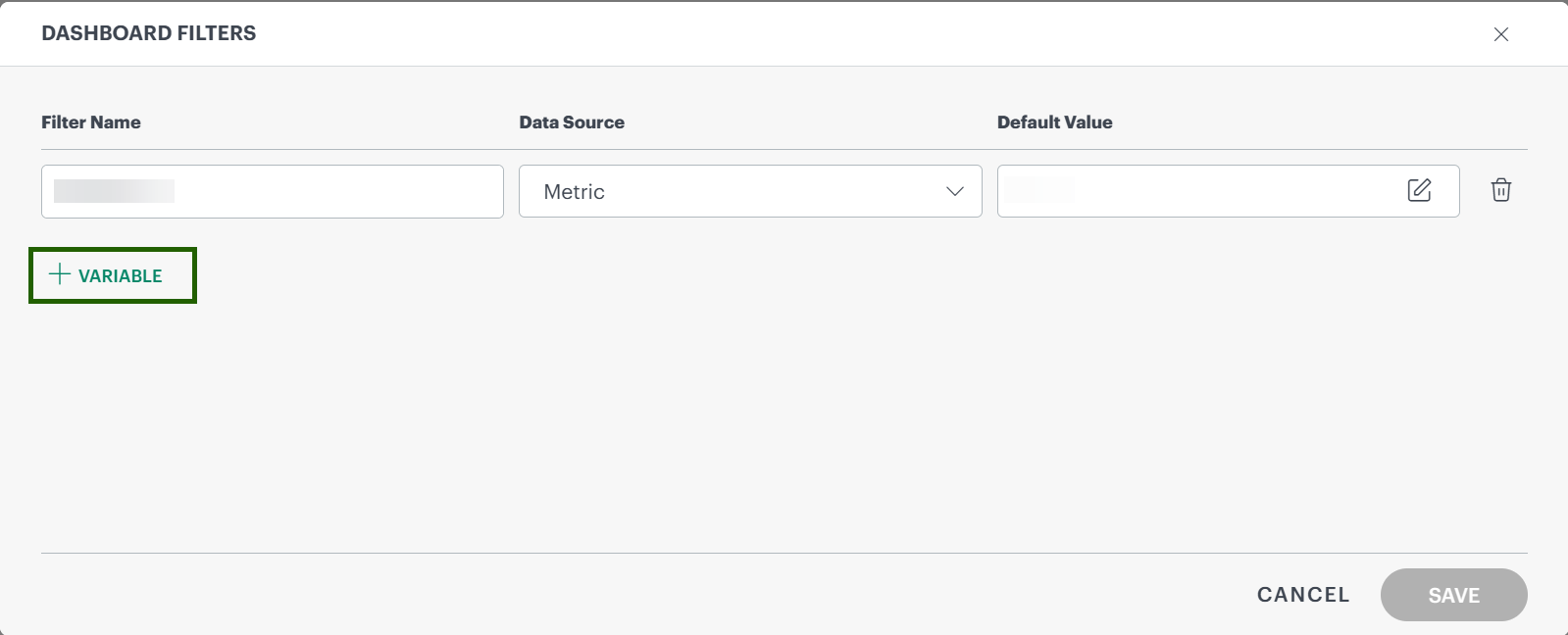 Users can manage variables here to enable filters. At the partner level, the metric filter is not enabled.Choose a name for the filter.