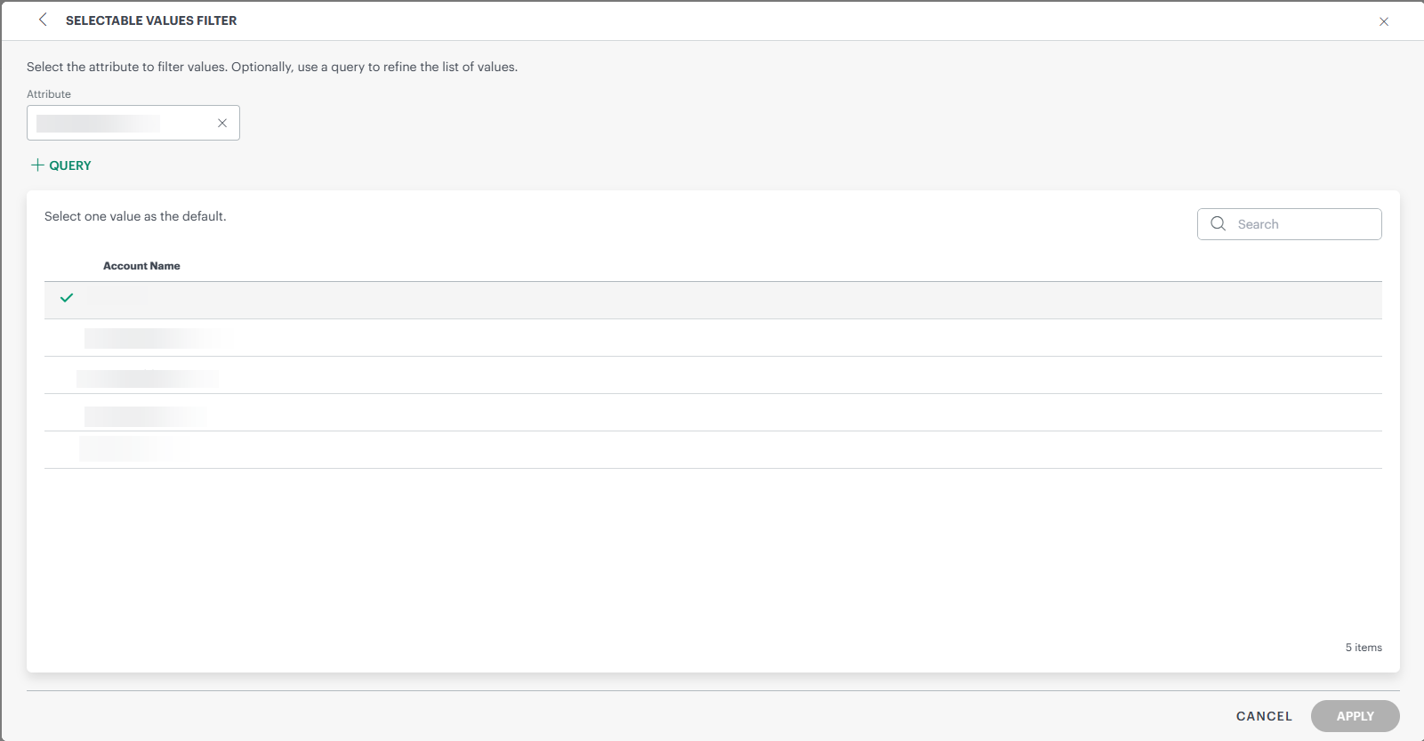 Enter a default value for the filter. When clicking on Default Value, the attributes page appears.