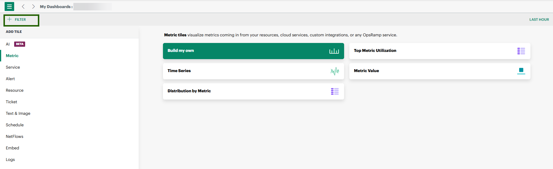 See Create Dashboards to learn about creating dashboards.Click on + Filter.